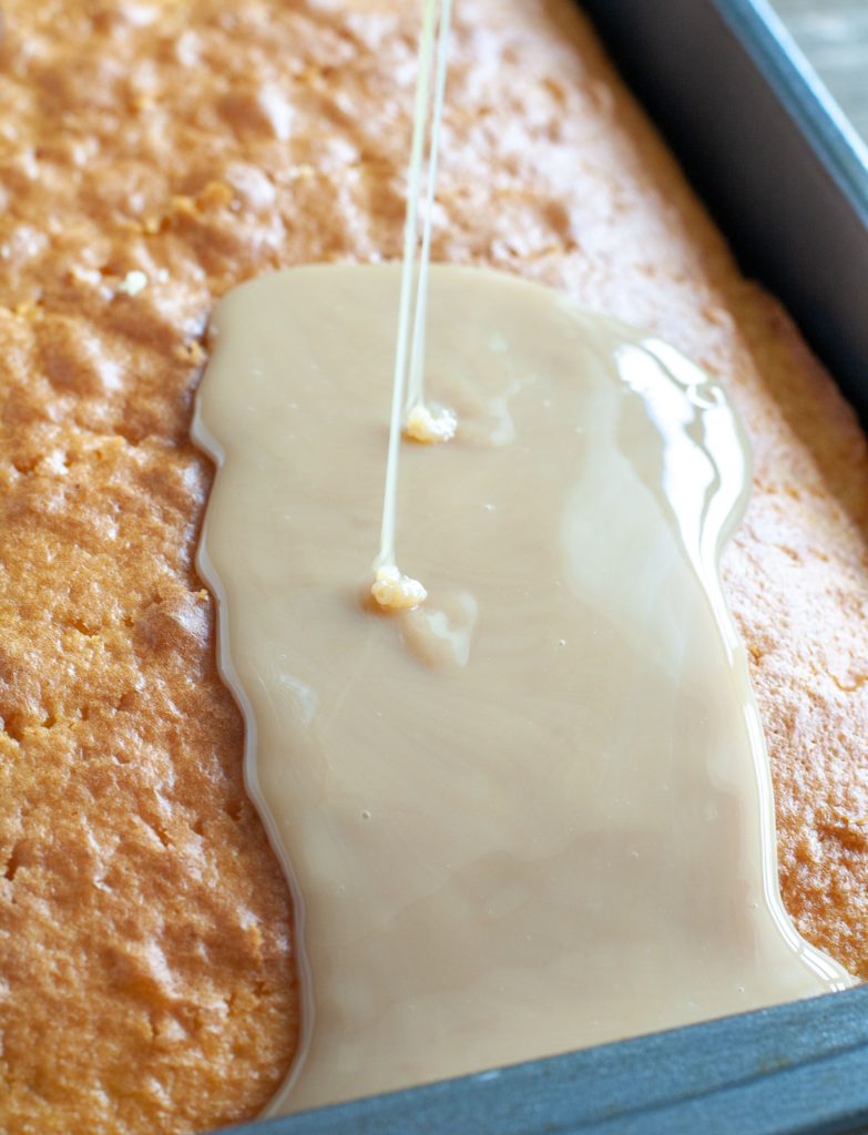 Step four: Pour the sweetened condensed mixture all over the cake. Make sure to spread it out evenly.