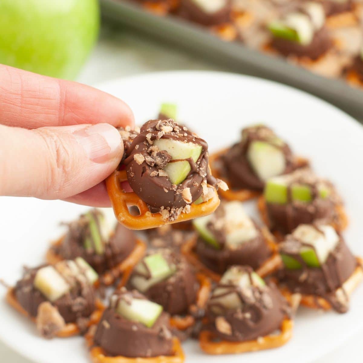 Scroll to the bottom for the full caramel apple pretzel bites recipe.