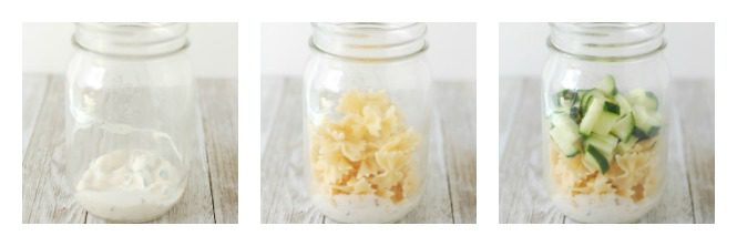 For the pasta salad, we started with a homemade ranch dressing. Next layer in cooked pasta and diced cucumber.